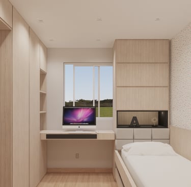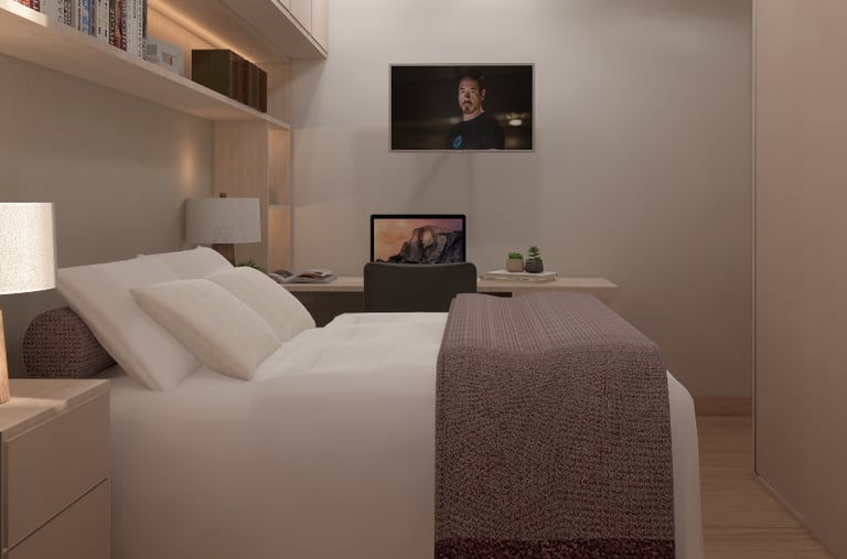 Quarto do casal planejado para oferecer conforto, privacidade e uma atmosfera tranquila, com um layout que valoriza a organização e o descanso.