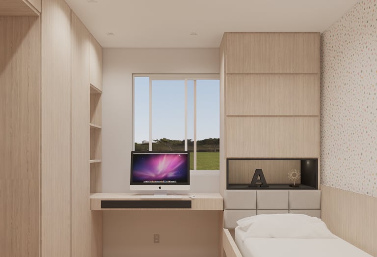 Quarto adaptado para atender às necessidades de uma adolescente, com um layout funcional e personalização do espaço.