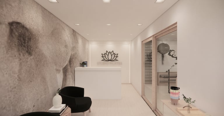 Projeto de reforma de um espaço comercial, com aproximadamente 70 m², concentrado na área de entrada e na sala principal do estúdio.